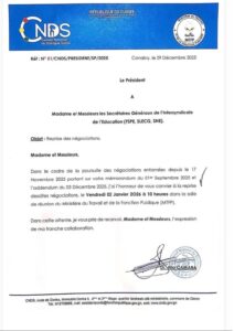 Dans une correspondance adressée à Avenirguinee, le Conseil national du dialogue social a convié la FSPE, le SLEGC et le SNE à une rencontre de négociation, dans l’espoir de parvenir à un accord et d’éviter une crise majeure dans le secteur éducatif.